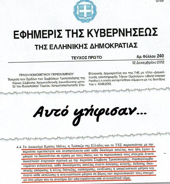 Μετά την πρόσφατη ψήφιση της Πράξης Νομοθετικού Περιεχομένου, δεν ισχύει η ασυλία της δημόσιας περιουσίας του κράτους. Τώρα οι δανειστές μπορούν να κατάσχουν, όχι μόνο την ιδιωτική περιουσία του κράτους (ακίνητα, κτίρια, κεφάλαια κ.λπ.), αλλά και τη δημόσια (λιμάνια, αεροδρόμια, αρχαιολογικούς χώρους, αιγιαλούς κ.λπ.).