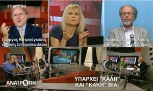Άκουσα τον Πάγκαλο, που καταδίκασε σε θάνατο τον ελληνικό λαό με τα μνημόνια, που κατά καιρούς έχει βρίσει χυδαία διάφορες κοινωνκές ομάδες, ενώ έχει σηκώσει και χέρι σε πολίτες, να μιλάει για τραμπούκους. Τον άκουσα ακόμα να λέει με κομπασμό ότι ο ελληνικός λαός τον εξέλεγε εκπρόσωπό του για τριάντα χρόνια. Τον ίδιο λαό δεν διστάζει να τον αποκαλέσει δημόσια διεφθαρμένο και άχρηστο. Επίσης κατηγόρησε τον Κατρούγκαλο ότι έχει κάνει το πανεπιστήμιο σκουπίδι, αυτός που το κόμμα του έχει διαλύσει τη δημόσια παιδεία. Στην ίδια εκπομπή ο Γρυσπολάκης έλεγε ότι τον είχαν κλειδώσει για μερικές ώρες στο γραφείο του και ζητούσε απ” τον Κατρούγκαλο να καταδικάσει αυτό το γεγονός. Ο ίδιος ωστόσο που ζητάει την καταδίκη της βίας έχει στείλει μπράβους του να χτυπήσουν φοιτητές.