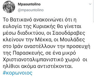 Οι δικοί μας, σήμερα, 11 μέρες μετά το πρώτο κρούσμα και με πολλαπλάσια κρούσματα από όσα είχε η Ιταλία στο πρώτο δεκαήμερο, μας λένε: «Θα εξακολουθήσουμε στις Ορθόδοξες Εκκλησίες μας να λειτουργούμε και να κοινωνούμε, έχοντας την βεβαιότητα ότι κοινωνούμε στη Ζωή και στην Αθανασία».