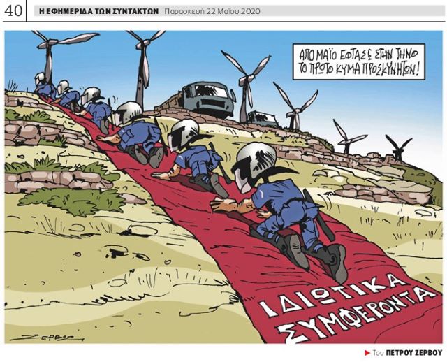 Το παρακάτω βίντεο προσφέρει ένα πολύ ουσιαστικό συμπέρασμα.Μπορεί οι μπάτσοι λειτουργώντας σαν μπράβοι της εταιρείας που είχε αναλάβει να εγκαταστήσει τις ανεμογεννήτριες στην Τήνο, να εκτόνωσαν όλη την κτηνωδία τους σε όσους/ες αγωνιζόταν να αποτρέψουν την καταστροφή του φυσικού περιβάλλοντος "φυτεύοντας" τόνους τσιμέντου και σιδήρου, βρέθηκαν όμως μπροστά σ' αυτό που ονομάζεται λαϊκή αντιβία. Και όταν αυτή εκδηλώνεται με μαζικά χαρακτηριστικά είναι ανίκητη.