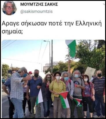Ο γνωστός και μη εξαιρετέος Σάκης Μουμτζής στο φιλοϊσραηλινό ντελίριο του, ανάρτησε μια φωτογραφία στο διαδίκτυο με συριζαίους, όπως γράφει, να κρατάνε Παλαιστινιακές σημαίες και αναρωτιέται αν "σήκωσαν ποτέ την Ελληνική".